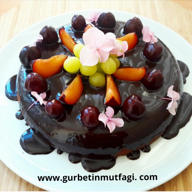 - Pişen kekimizi ters çevirelim ve üzerine ortadan başlayarak sosumuzu dökelim